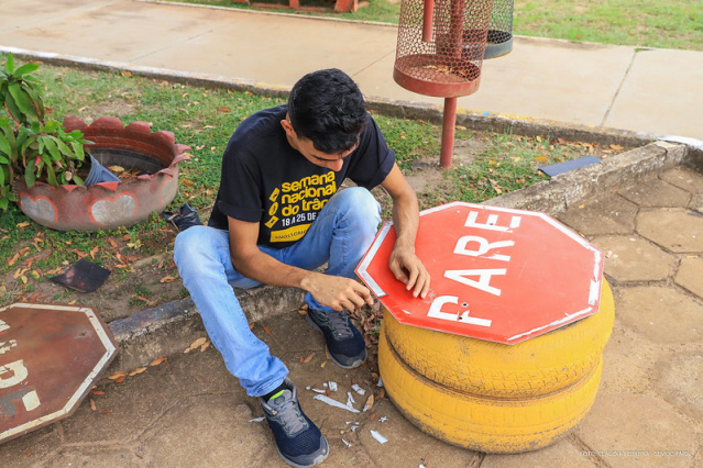 Trânsito – Os alunos da Oficina de Educação para o Trânsito estão empenhados no trabalho de recuperação de placas de trânsito. Até o final da semana, 100 placas serão revitalizadas e 100 abraçadeiras serão confeccionadas. Na semana passada, eles concluíram a pintura de 500 m² de ciclodivisores das avenidas Benjamin Constant e Juscelino Kubitschek.