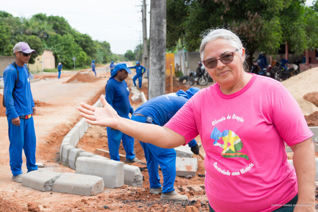 “As obras que estão passando na nossa rua eram tão esperadas. Graças a Deus veio. A gente está muito feliz mesmo, porque a qui nessa rua já atolou tanto carro. A gente saia metendo o pé na lama. E agora calçadinha ai, eu que faço caminhada de tardinha, agora vou fazer caminhada na frente da minha casa, tudo calçadinho, tá ótimo. Estou muito feliz e agradecida à Deus pela nossa prefeita”