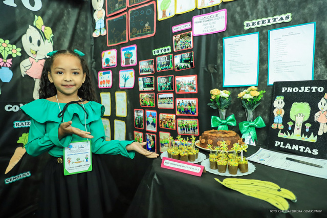 Izadora Leticia de Moraes, de 7 anos, da Escola Municipal Branca de Neve, aprendeu e apresentou direitinho o projeto sobre As plantas que comemos , que aborda o reaproveitamento de sobras de vegetais para o cultivo e manejo de alimentos orgânicos.
