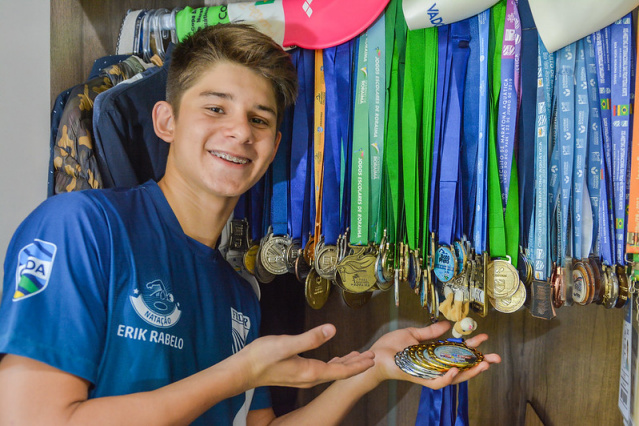 No último fim de semana, o atleta Erik Rabelo, de 16 anos, foi um dos grandes destaques na 3ª Etapa do Campeonato Amazonense de Natação, onde estabeleceu novo Recorde Estadual Juvenil e conta agora com mais de 100 medalhas na categoria. Ele é um dos jovens que são apoiados pelo programa Bolsa Atleta, da Prefeitura de Boa Vista.