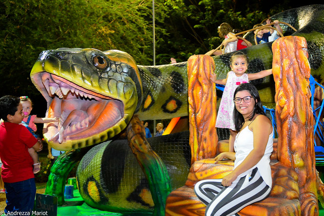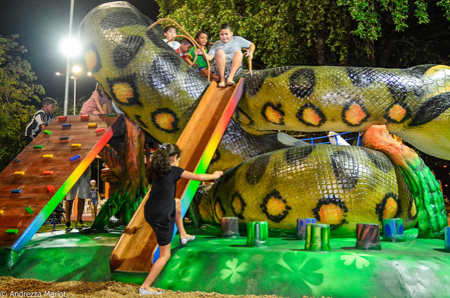 O espaço ganhou uma cobra da espécie sucuri com 3,50 metros de altura e 17 metros de comprimento. Esse novo exemplar tem um diferencial: o bicho vem com escorregador , escada comum e de cordas e uma ponte de madeira . A ideia é proporcionar mais interação entre as crianças e o brinquedo.