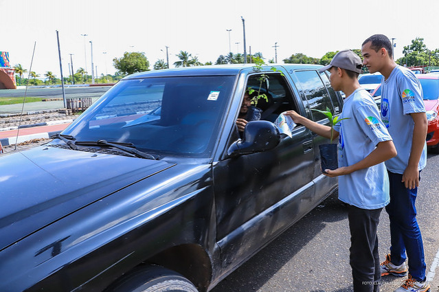 Pela m anhã, a ação educativa aconteceu na a venida Brigadeiro Eduardo Gomes, próximo a um posto de combustíveis. Em média, 70 alunos das oficinas foram envolvidos na atividade, que contou com entregas de mudas de ipê (amarelo e rosa), palmeira imperial anã, açaí, moringa e mudas de Nim.
