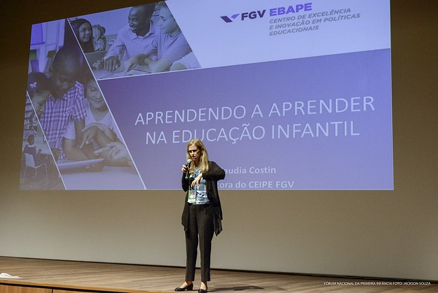 A segunda palestra, Claudia Costin, é diretora do Cento de Excelência e Inovação em Políticas Educacionais (Ceipe) da Fundação Getúlio Vargas, mas fez questão de ressaltar que começou sua carreira como professora educadora de jovens e adultos, destacando o valor que tem o professor no processo de ensino.