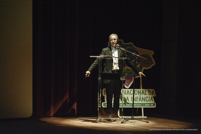 A primeira palestra do dia foi ministrada pelo professor Vital Didonet, Especialista em Políticas para a Primeira Infância na Rede Nacional Primeira Infância, que abordou um pouco sobre o cuidado e a visão que todos devem ter em relação à criança, ressaltando que isso é responsabilidade de todos.