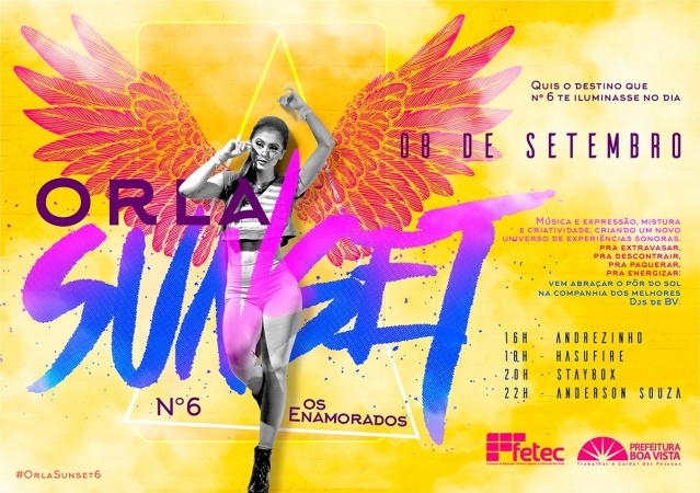 Neste sábado, 8, a Orla Taumanan será palco da sexta edição do Orla Sunset. O evento promovido pela Prefeitura de Boa Vista, por meio da Fundação de Educação, Turismo, Esporte e Cultura (Fetec), terá início às 16h e é destinado para todas as idades. A proposta é que famílias e amigos possam curtir juntos o pôr do sol mais bonito da cidade com muita música e Djs.