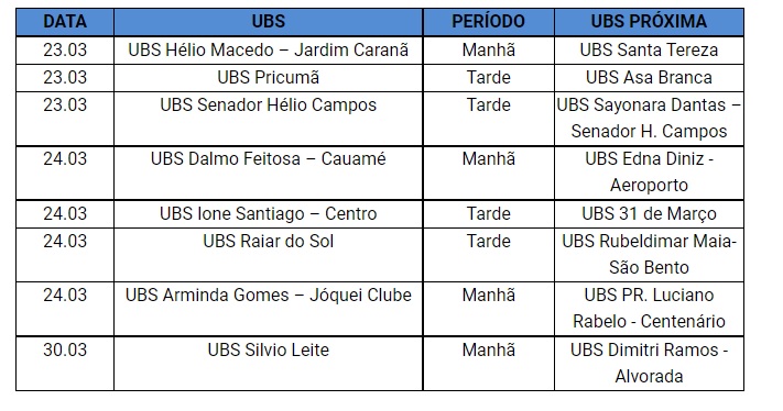 A Prefeitura de Boa Vista informa que vai capacitar os profissionais das unidades básicas de saúde para utilização da ferramenta PlanificaSus. Em virtude disso, seguindo um cronograma de períodos e datas diferenciadas, os atendimentos nas UBS poderão ser redirecionados para unidades mais próximas (veja abaixo).