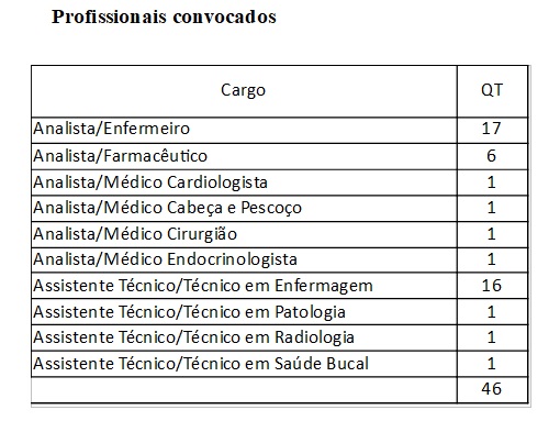 Estão sendo convocados 5 bioquímicos, 2 biomédicos, 3 cirurgiões dentistas, 23 enfermeiros, 2 técnicos em nutrição, 12 técnicos em enfermagem e 5 técnicos em laboratório.