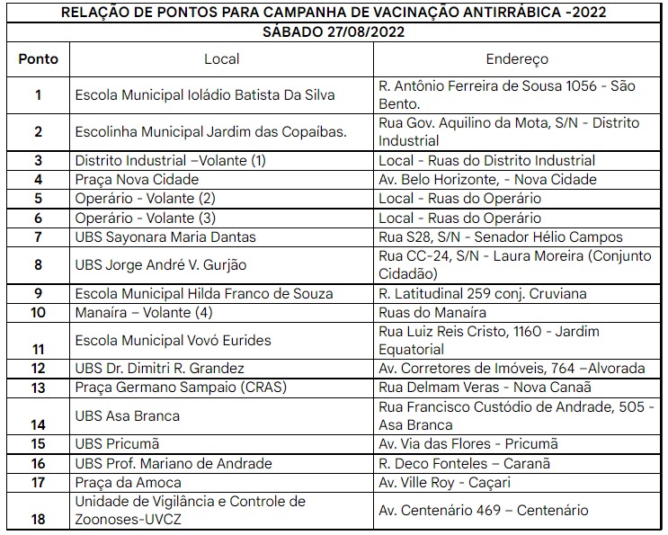 A Prefeitura reforça que a vacinação contra a Raiva está disponível durante todo o ano, de segunda a sexta-feira, em horário comercial, na Unidade de Vigilância e Controle de Zoonoses (UVCZ), no bairro Centenário.
