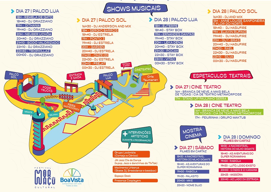 O Mormaço Cultural 2022 – 1° Festival de Artes Integradas ‘já tá bombando!’ A programação, iniciada às 16h no Parque do Rio Branco e Orla Taumanan segue até 1h, com diversos shows musicais. Em destaque, o cantor regional Neuber Uhcôa e o cantor Frejat, a atração rock’n Roll do evento, que se apresenta a partir das 23h10, no Palco Sol.