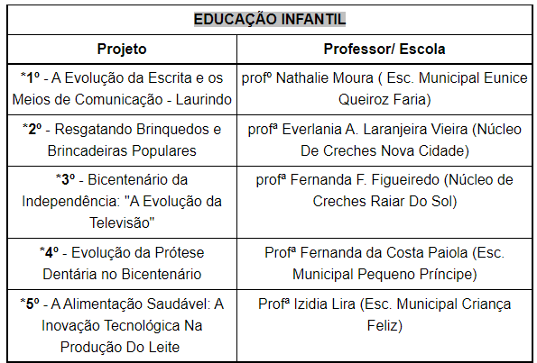 Cerca de 800 pequenos cientistas e seus mestres marcaram presença com seus experimentos e projetos de pesquisas. Quem conquistou o 1º lugar na Educação Infantil (creche e pré-escola) foi a turminha do maternal D, da Escola Municipal Eunice Queiroz de Faria, com o projeto “A Evolução da Escrita e os Meios de Comunicação”, da professora Nathalie Moura.