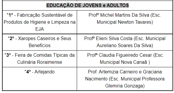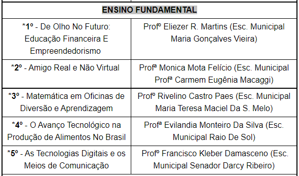 No Ensino Fundamental (1º ao 5º Ano), o 1º lugar foi para o projeto “De Olho no Futuro: Educação Financeira e Empreendedorismo”, do professor Eliezer Martins e sua turma do 4º ano A, da Escola Municipal Maria Gonçalves Vieira. Com o título, a escola ganhou a oportunidade de representar Boa Vista na próxima edição da Feira Mineira de Iniciação Científica (FEMIC 2023).