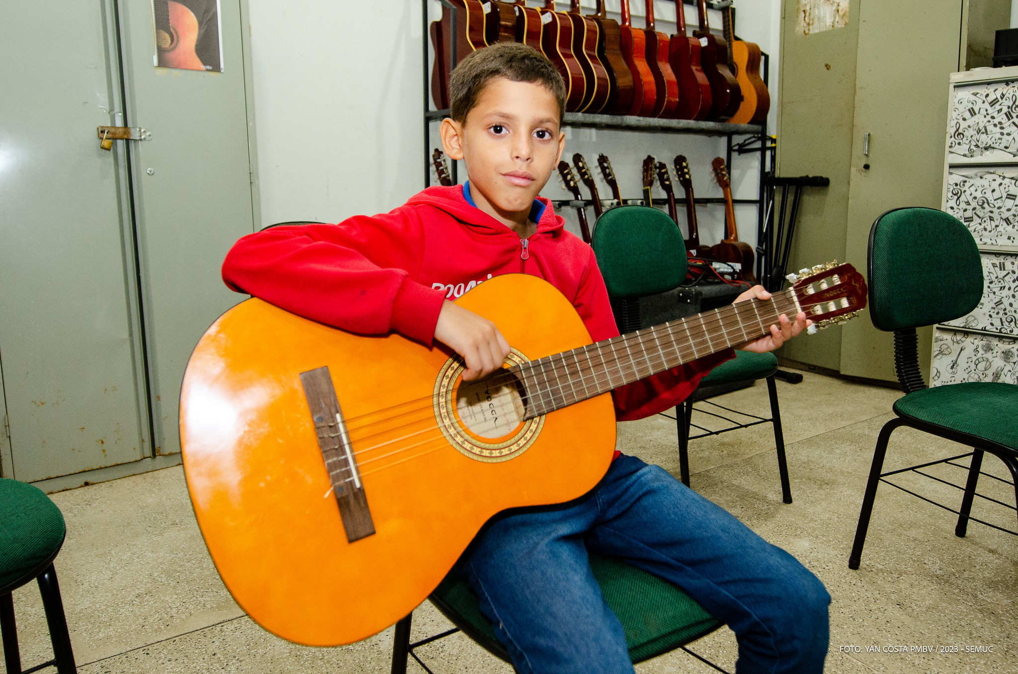 Dima Antônio, de 9 anos, está na aula de violão, instrumento que ele admira desde os 7, quando ganhou o seu de seus pais. Para ele, estudar música é agradável e envolvente, principalmente porque ele quer se profissionalizar na área. “Quero tocar em muitos eventos, ser bastante conhecido”, disse.